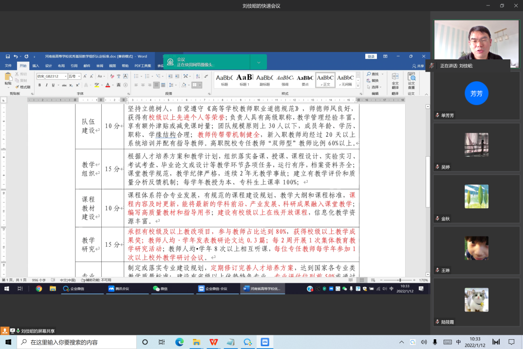 随后,刘伎昭主任领学了《河南省高等学校优秀基层教学组织认定标准》、《省级一流本科专业建设点申报工作要求》等文件,对标找差、进一步明确建设目标和任务;单芳芳副主任通报了实践教学总体情况,对实践环节存在的问题进行了梳理,并提出了切实可行的解决思路。