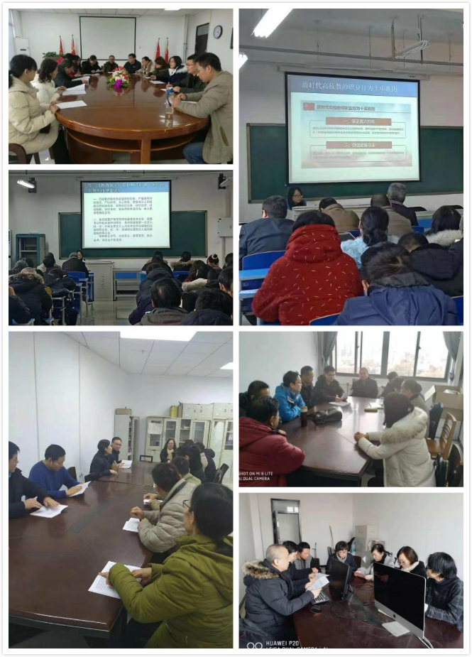为深入贯彻习近平新时代中国特色社会主义思想和党的十九大精神,深入贯彻落实全国教育大会精神,进一步加强师德师风建设,12月11日下午,开元集团官网入口按照学校的要求,组织全体教师在3号组团A906集体学习教育部《新时代高校教师职业行为十项准则》(以下简称《准则》)和《高校教师师德失范行为处理的指导意见》(以下简称《意见》)。