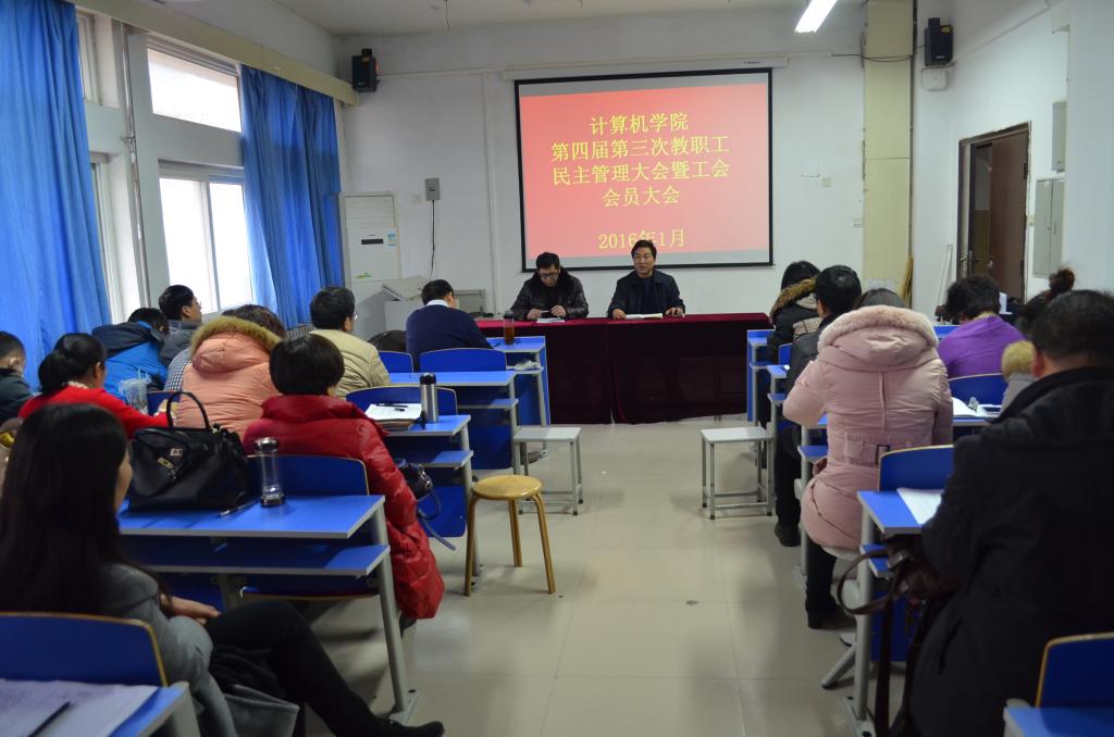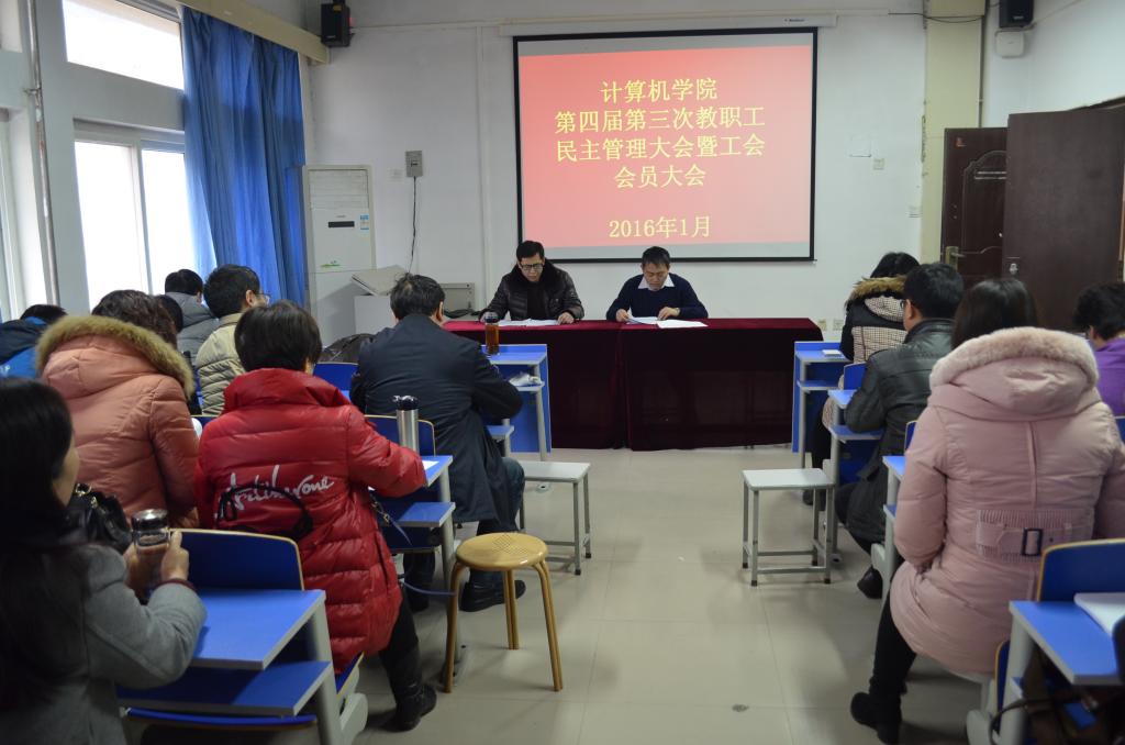 2016年1月5日下午,开元集团官网入口四届三次二级教代会在8号楼524召开,会议由开元集团官网入口工会主席徐飞主持。按照会议议程,在奏唱雄伟的国歌之后,院长郑秋生做了学院工作报告和财务收支情况报告,工会主席徐飞做了工会工作报告并对提案回复情况进行介绍,苏安婕老师对工会财务收支情况向大会进行报告。
