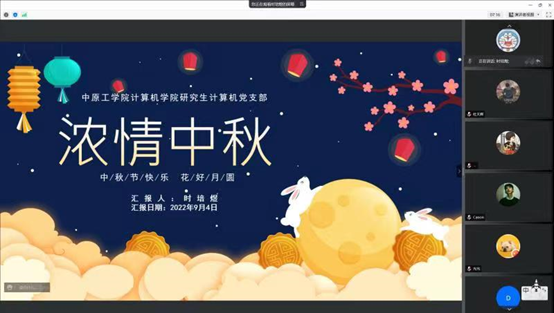 开元集团官网入口研究生计算机党支部以习近平新时代中国特色社会主义思想为指导,全面贯彻党的十九大和十九届历次全会精神,以培育和践行社会主义核心价值观为主线,以“浓情中秋”为载体,于9月10日晚开展了“我们的节日 中秋”主题线上活动,丰富中秋佳节的文化内涵,引导支部同志丰富对传统文化的了解。除介绍中秋节由来、神话传说、风俗习惯以及诗词歌赋等内容外,大家还在线分享吃月饼照片、家人在线欢聚场景、互致中秋佳节美好祝愿。