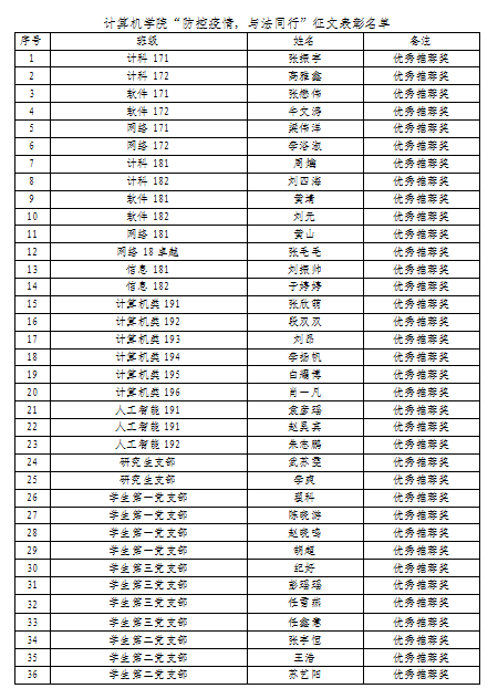 经积极发动,认真评选,以下同学获奖(名单如下),希望受表彰的同学珍惜荣誉,谦虚谨慎,再接再厉,争取更大的成绩,希望全体学生以受表彰的同学为榜样,树立依法防控、科学防控的意识,增强打赢防疫人民战争的信心和决心。