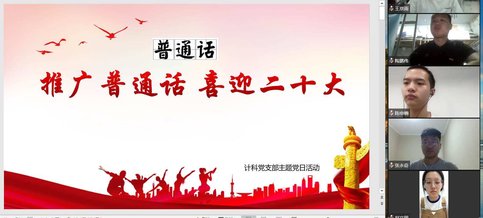 根据《河南省教育厅等九部门转发教育部等九部门关于开 展第25届全国推广普通话宣传周活动的通知》(教社语〔2022〕 253号),每年9月第三周为全国推广普通话宣传周,2022年9月12日至18日举办第25届推普周。我支部以“推广普通话,喜迎二十大” 为主题,紧紧围绕迎接宣传贯彻党的二十大,广泛、深入开展形式多样、内容丰富、特色鲜明的推广普及国家通用语言文字和传承弘扬中华优秀语言文化的主题党日活动。
