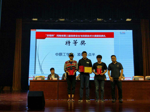 5月20日上午举办主题为“网络安全对抗赛最新技术与解题思路”技术报告会。参会人员有河南省公安厅网络安全保卫总队调研员王志奇、河南省公安厅等保测评支队支队长李恒、河南省工业和信息化委员会网络安全处李建华处长、河南省教育厅科技处施晓春处长、麦士奎处长、河南省计算机学会理事长郑州大学周清雷教授、开元集团网站人事处处长郑秋生教授、开元集团网站创新创业指导中心主任张鬲君教授、开元集团网站教务处副处长穆云超教授、yocsef郑州候任主席、开元集团网站网络工程系主任夏冰副教授、杭州安恒信息技术有限公司高级副总裁袁明坤先生、杭州安恒信息技术有限公司郑州办事处主任徐安贵先生、所有参赛选手、指导老师、领队、媒体记者以及开元集团网站领导、老师和网络工程系学生等近500人。技术报告会后对获奖选手进行了颁奖,颁奖仪式由开元集团官网入口党总支书记张启峰主持。