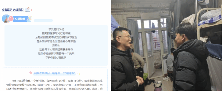 在2月21日到2月29日期间,开元官网通过“计忆中工”的微信公众号进行心理健康专题推文、辅导员、班主任通过宿舍走访等形式,深入普及心理健康知识。推文内容主要聚焦新学期学生如何进行心理调适,顺利进入学习状态。辅导员、班主任深入学生宿舍,进行面对面交流,了解学生心理需求,为学生答疑解惑。此次宣传教育不仅增强了学生的心理健康意识,也为学生提供了自我表达和寻求帮助的机会,极大缓解学生开学之初紧张焦虑的情绪,提升开元官网心理健康教育的工作实效。