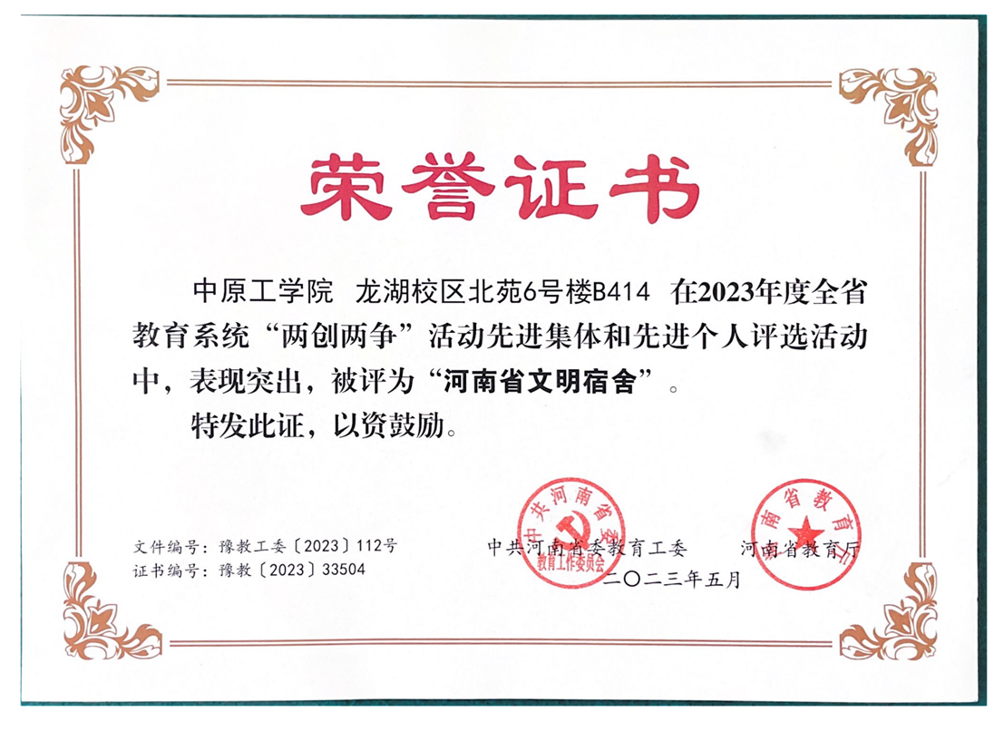 近日,中共河南省委教育工委、河南省教育厅公布2023年度全省教育系统“两创两争”活动先进集体和先进个人评选结果,开元集团官网入口北苑6号楼B414 宿舍在评选活动中,表现突出,被评为“河南省文明宿舍”。
